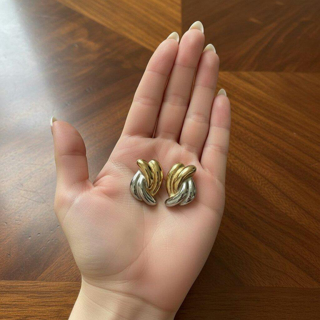 Add effortless elegance to your look with these sculptural two-tone knot earrings. Featuring a fluid mix of silver and gold tones, they bring a modern twist to a timeless design. Lightweight and polished, they transition seamlessly from day to night, making them the perfect statement piece you’ll want to wear on repeat.